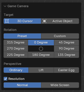 最后是分辨率选项,可以在Normal(正常游戏视角)和Wide Screen(加入宽屏补丁后的视角)之间进行选择。通常来说,选择正常游戏视角即可,无需针对宽屏进行特殊配置。此外如果不勾选分辨率这个选项,则不会修改当前选择摄像机的分辨率,由于Blender与Virtools摄像机的实现差异,也因此不会修改Blender渲染窗口的大小。有关该行为可参考Virtools属性页面的的Virtools摄像机章节。
