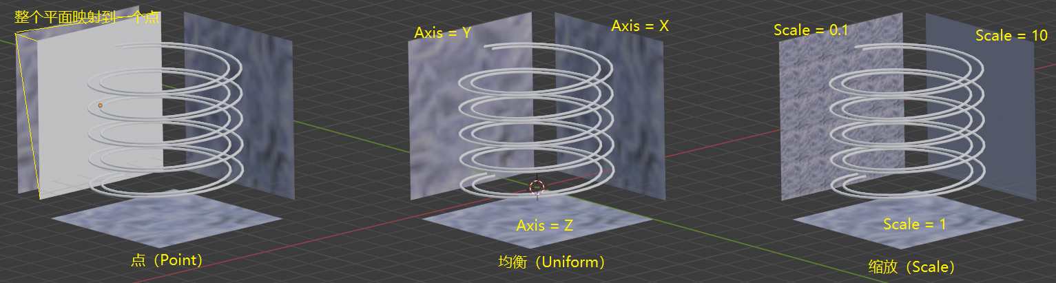 下图展示了三种类型的工作方式。首先讲解均衡类型。均衡类型会试图按照一个轴向(Projection axis),将物体套在整张钢轨贴图中并进行贴图,视觉上来说就像是将3D的钢轨按一个轴向拍扁到钢轨贴图的平面上,而钢轨中的网格在这个平面上的映射就成为了它对应的UV。而点类型和缩放类型则是均衡类型的扩展。缩放类型允许用户提供一个缩放值(Scale),这个缩放值控制了这张钢轨贴图的缩放,因此可以被看作原先的钢轨贴图变成了钢轨贴图的一部分(缩放大于1),又或者变成了多张钢轨贴图首尾相接(缩放小于1)。点类型则是将整个三维的钢轨映射到了一个点,因此也可看作特殊的缩放类型,其缩放值为0。